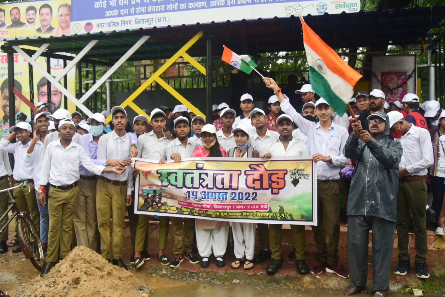 बिलासपुर। भारी बारिश के बीच आज़ादी के 75 वर्ष पूर्ण होने पर आज़ादी का अमृत महोत्सव के अंतर्गत स्वतंत्रता दौड़ का आयोजन 14 अगस्त को सुबह 8 बजे नेहरू चौक से लाल बहादुर शास्त्री चौक तक किया गया। इस आयोजन में विद्यालयीन छात्र-छात्राओं तथा विभिन्न विभागों के अधिकारी कर्मचारियों ने उत्साह के साथ भाग लिया। आज़ादी के 75 वर्ष पूरे होने पर आज़ादी के अमृत महोत्सव के इस कार्यक्रम में प्रतिभागियो का उल्लास देखने योग्य था। इस पर मानसून की बारिश ऐसी लग रही थी मानो आसमान भी आज़ादी के इस महापर्व पर अमृत बरसा रहा हो।