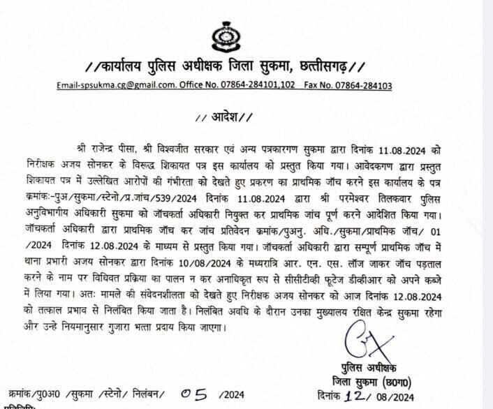 आला अफसरों ने इस मामले को तत्काल संज्ञान में लिया। सुकमा एसपी किरण गंगाराम चव्हाण ने कोंटा टीआई अजय सोनकर को रक्षित केंद्र सुकमा में अटैच कर दिया है। उन्होंने रविवार को आदेश जारी कर दिया है। आईजी ने बताया कि दंतेवाड़ा के पत्रकार बप्पी राय की कार में 40 किलो गांजा मिलने के मामले की जांच चिंतुर पुलिस कर रही है। वहां के थानेदार और अन्य अधिकारी कोंटा आकर पूरी पड़ताल कर रहे हैं।