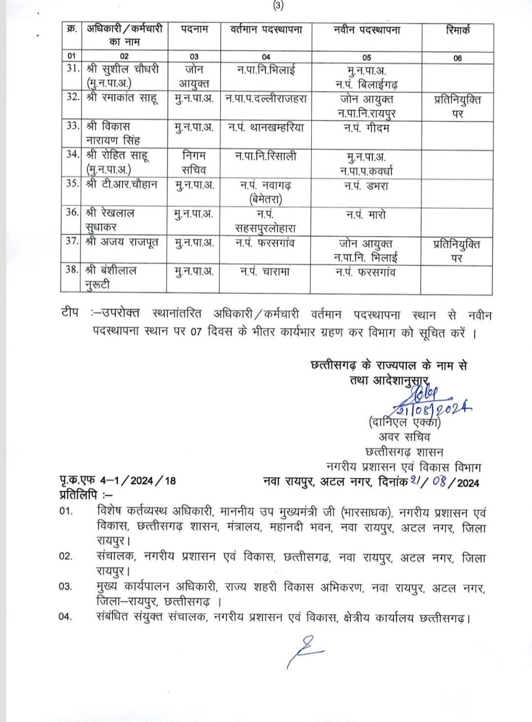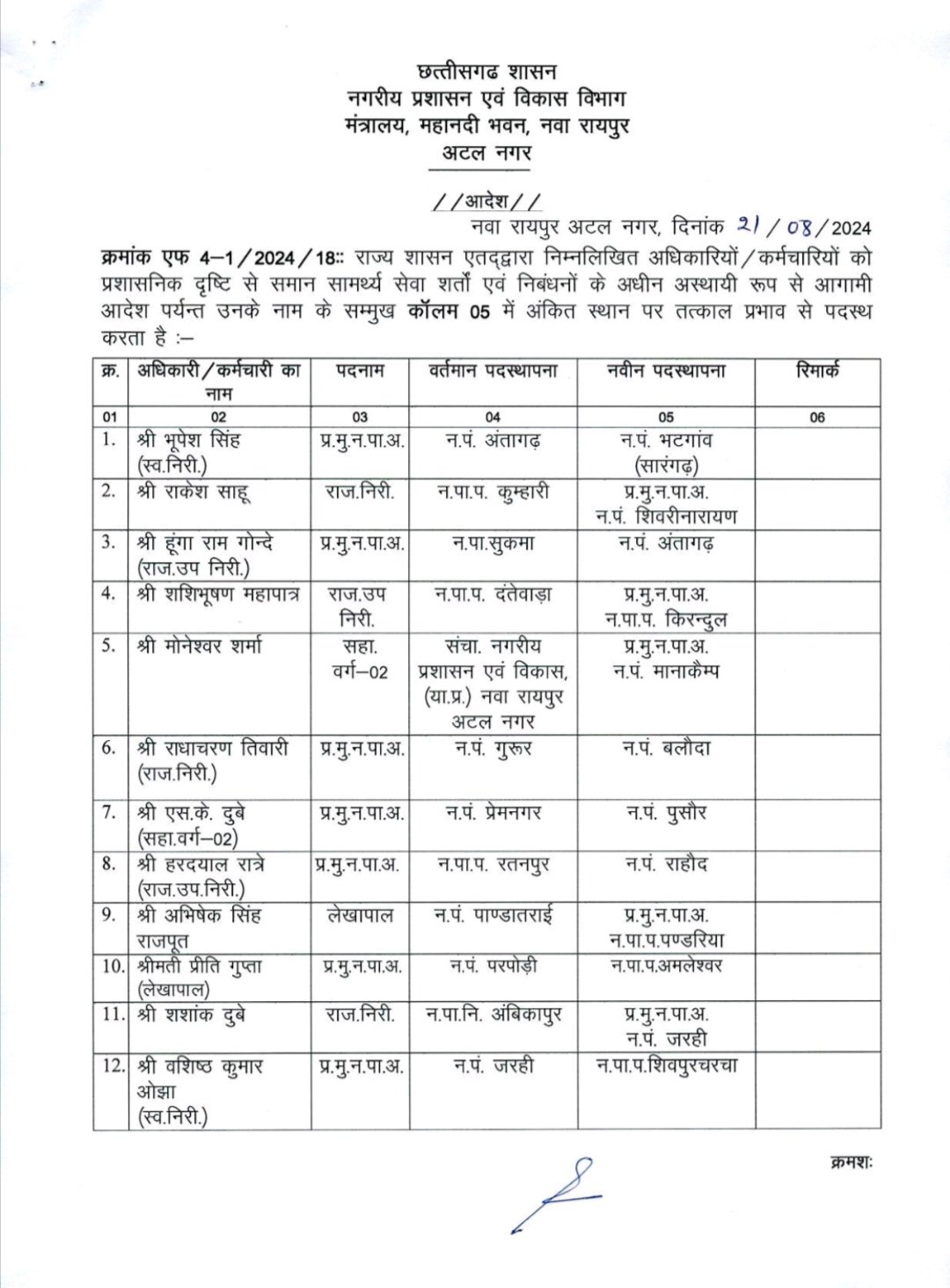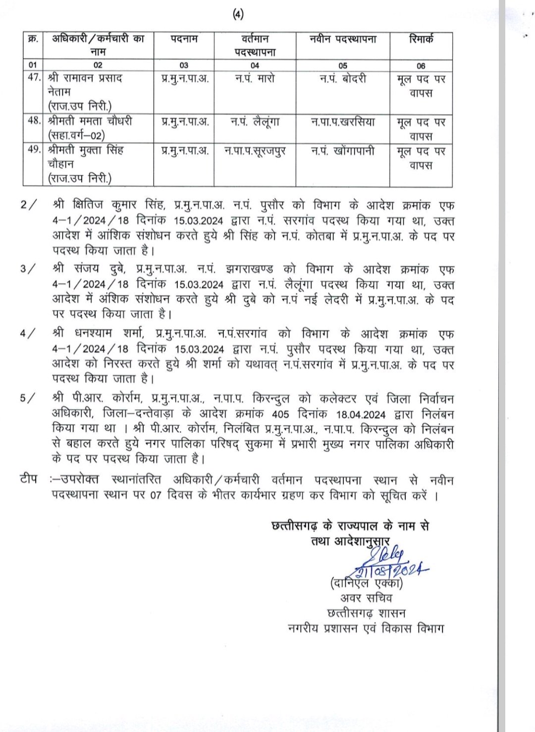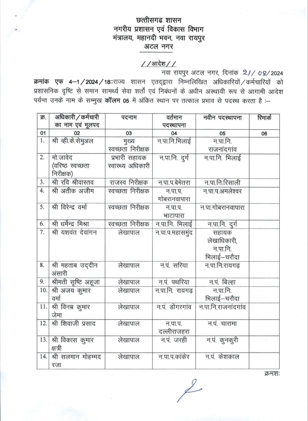 CG Transfer: रायपुर: सरकार ने आधी रात क़े बाद नगरीय प्रशासन विभाग में बड़ा तबादला आदेश जारी किया है। सरकार आने क़े बाद ये पहला ट्रांसफर होगा, जिसमे एकमुश्त 166 अधिकारी और कर्मचारियों को बदल दिया गया है। इनमें जॉइंट डाइरेक्टर से लेकर बाबू, ड्राइवर और चपरासी तक शामिल हैं।