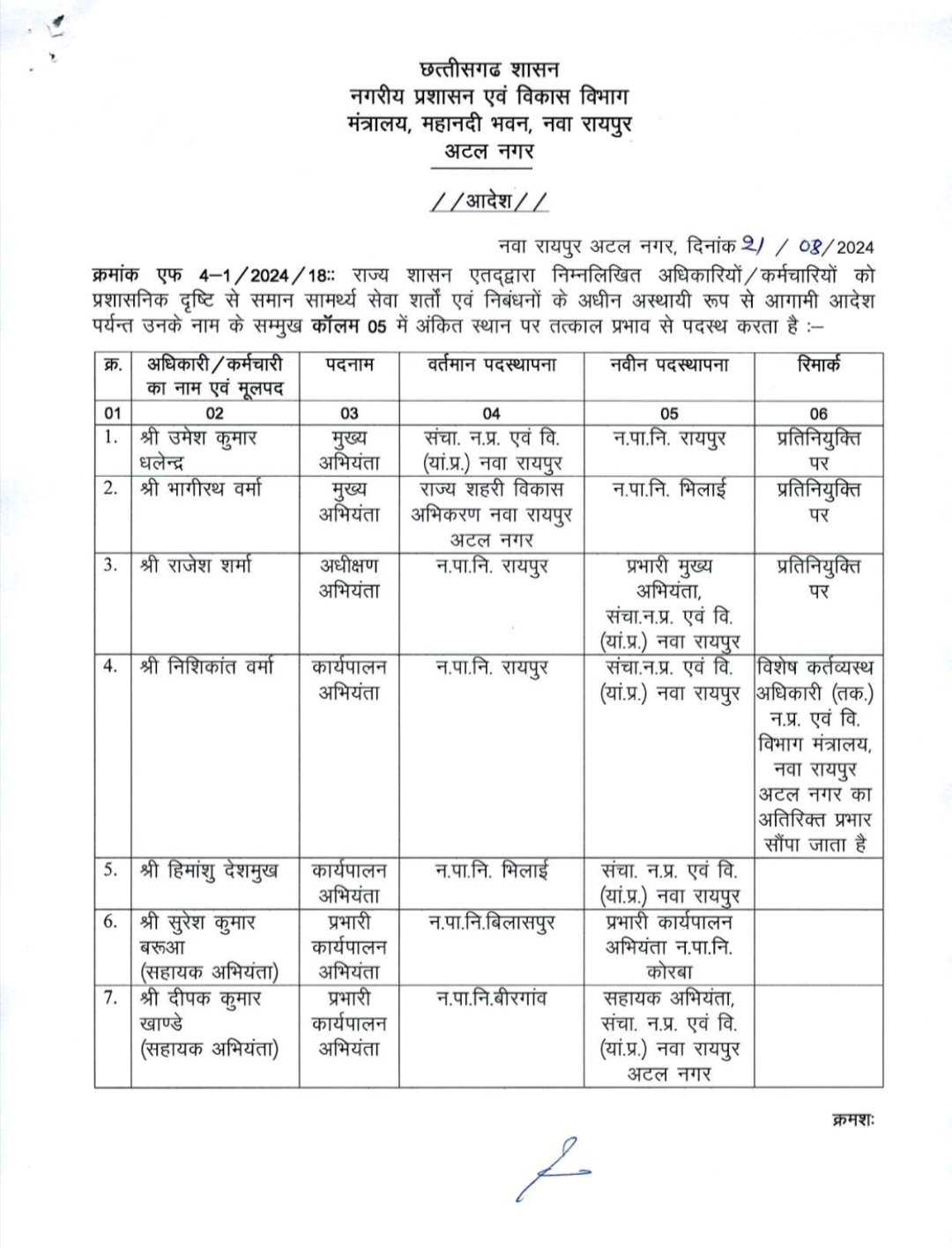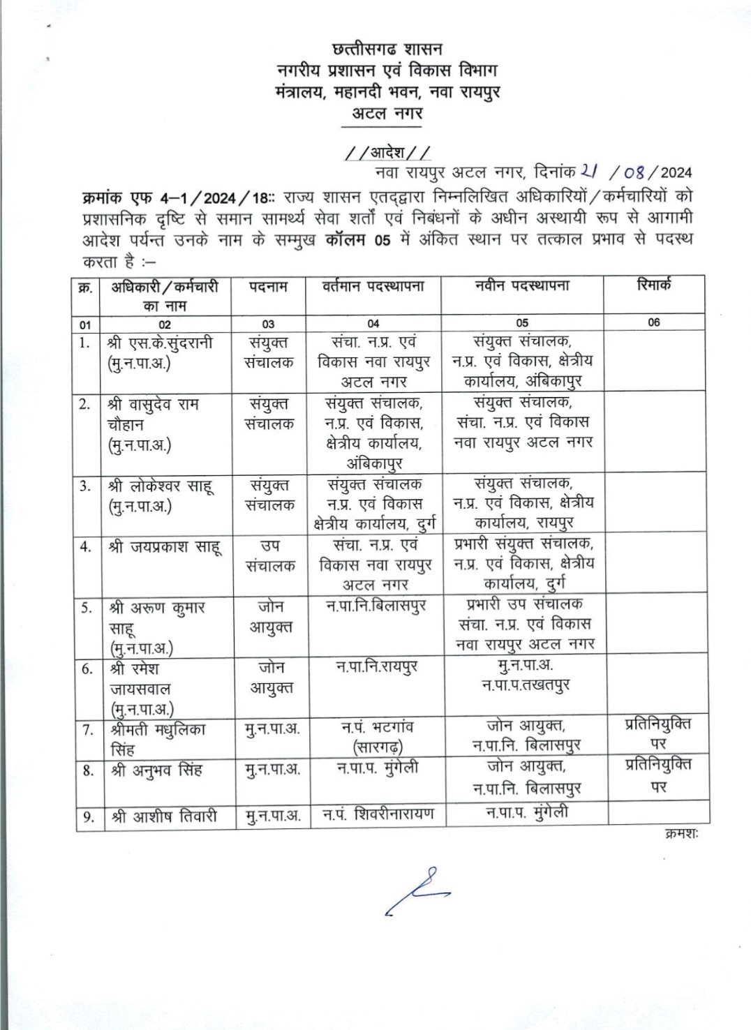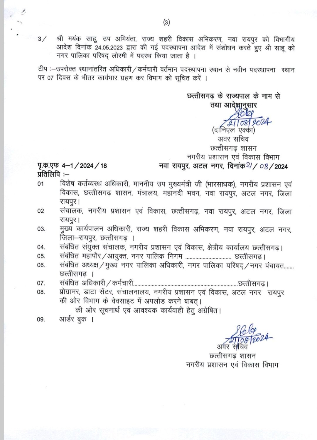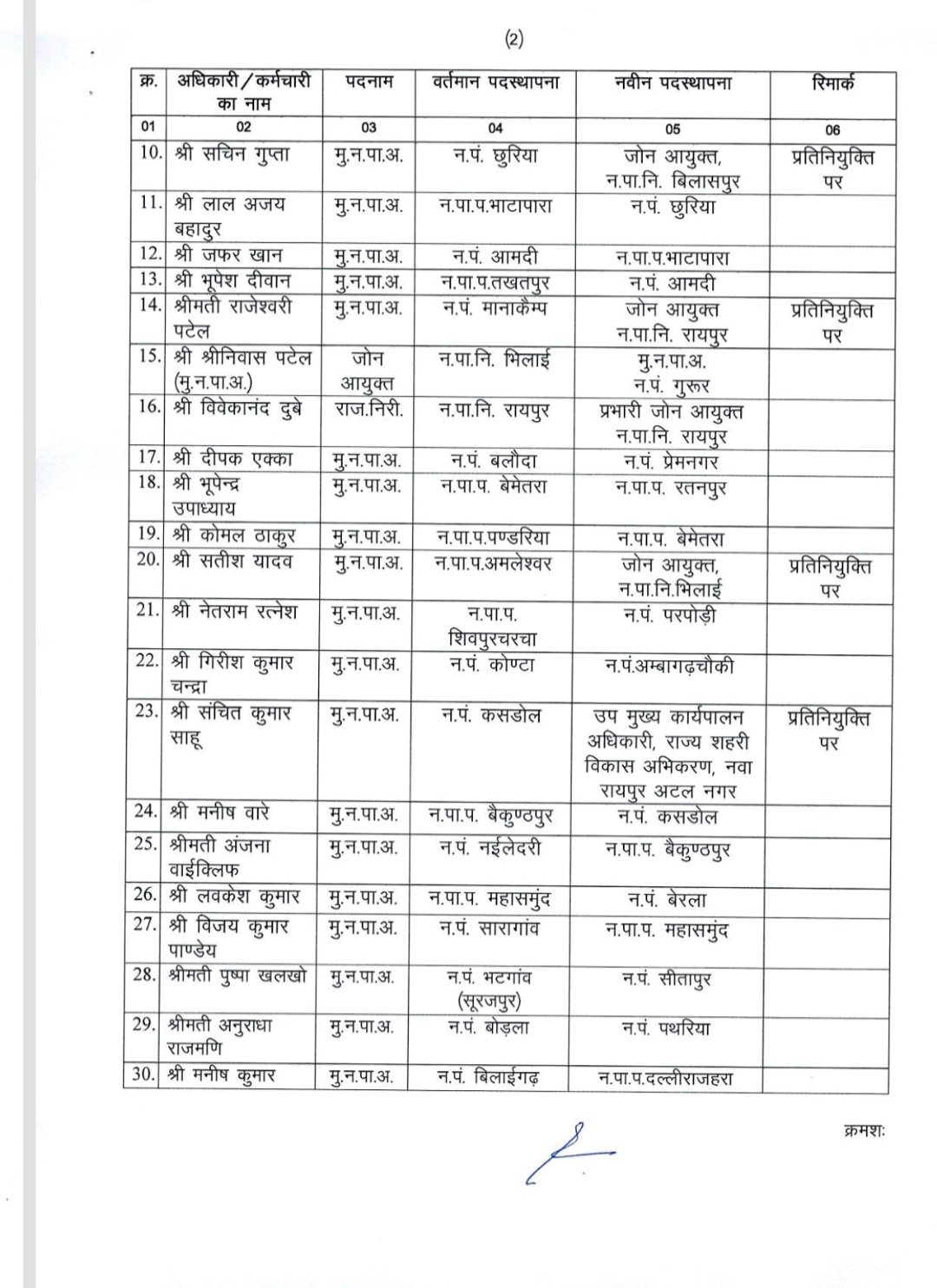 CG Transfer: रायपुर: सरकार ने आधी रात क़े बाद नगरीय प्रशासन विभाग में बड़ा तबादला आदेश जारी किया है। सरकार आने क़े बाद ये पहला ट्रांसफर होगा, जिसमे एकमुश्त 166 अधिकारी और कर्मचारियों को बदल दिया गया है। इनमें जॉइंट डाइरेक्टर से लेकर बाबू, ड्राइवर और चपरासी तक शामिल हैं।