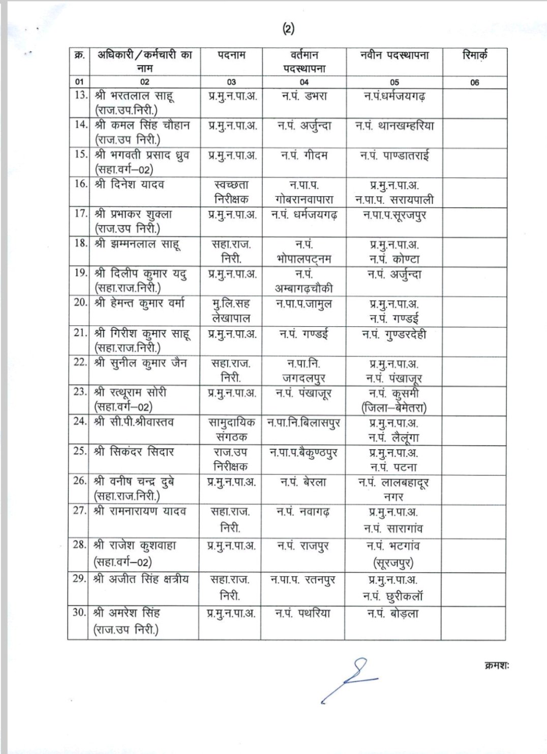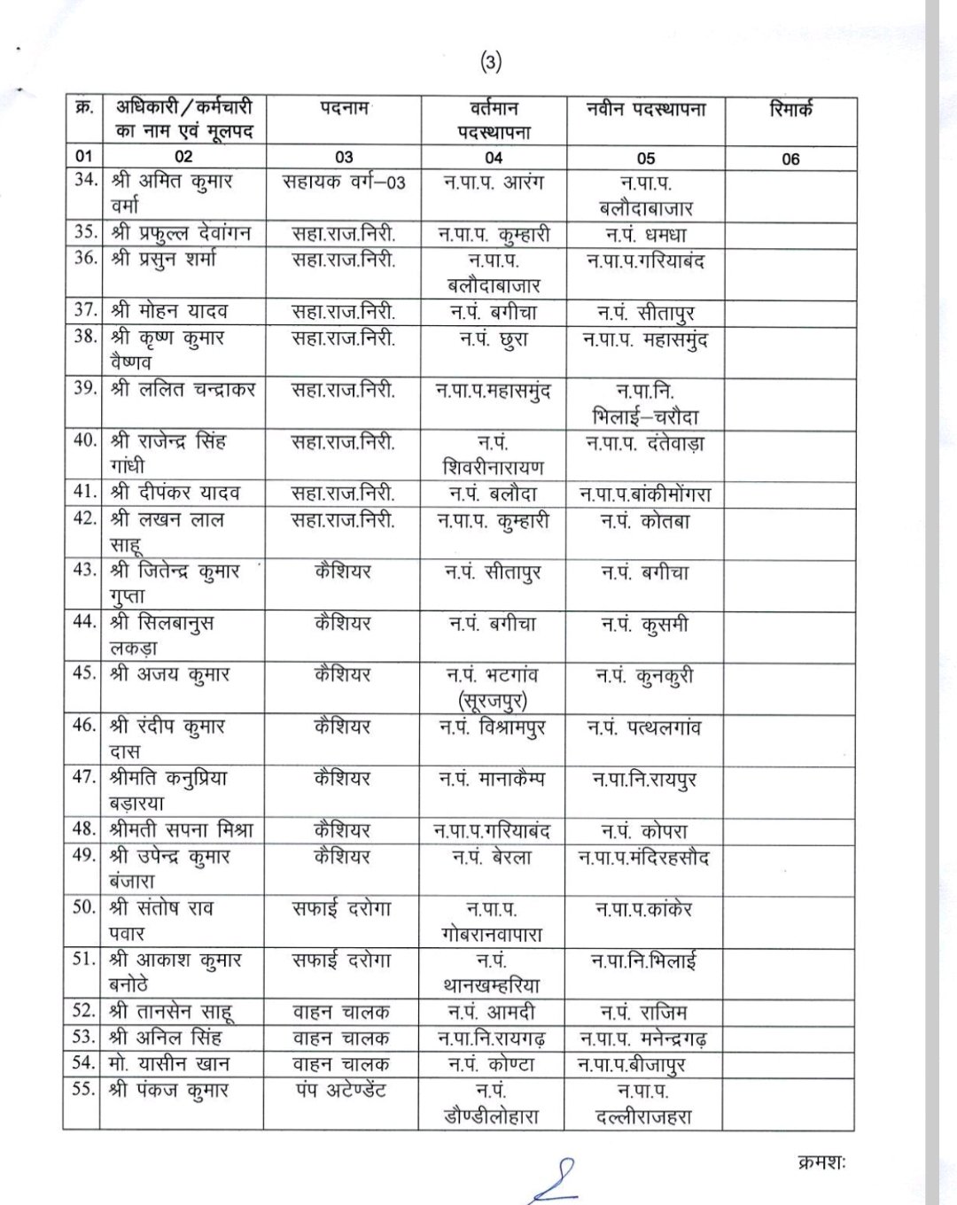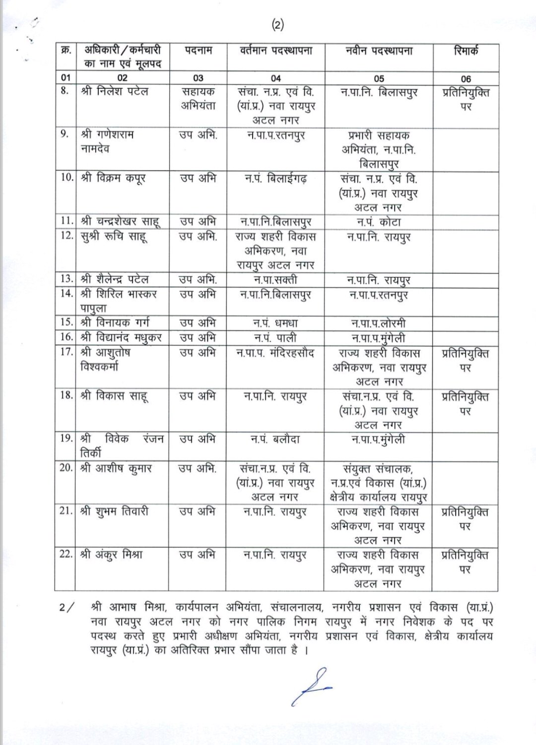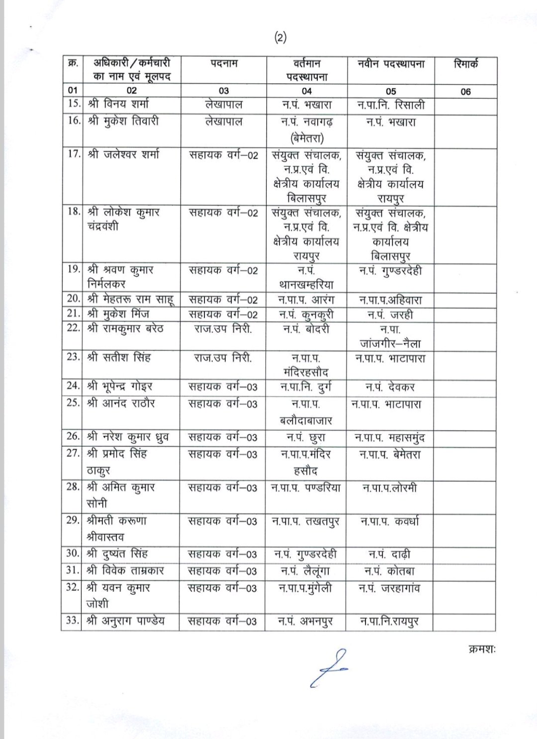 CG Transfer: रायपुर: सरकार ने आधी रात क़े बाद नगरीय प्रशासन विभाग में बड़ा तबादला आदेश जारी किया है। सरकार आने क़े बाद ये पहला ट्रांसफर होगा, जिसमे एकमुश्त 166 अधिकारी और कर्मचारियों को बदल दिया गया है। इनमें जॉइंट डाइरेक्टर से लेकर बाबू, ड्राइवर और चपरासी तक शामिल हैं।