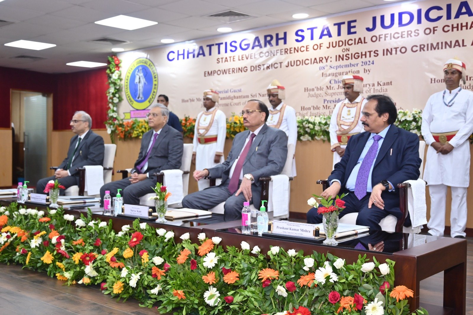 बिलासपुर। छत्तीसगढ़ उच्च न्यायालय, बिलासपुर में जिला न्यायपालिका के सशक्तिकरण और सिविल व आपराधिक विधियों पर मंथन के उद्देश्य से एक राज्य स्तरीय कान्फ्रेंस का आयोजन किया गया। इस महत्वपूर्ण कान्फ्रेंस की गरिमा सर्वोच्च न्यायालय के तीन सम्माननीय न्यायमूर्तिगणों—जस्टिस सूर्यकान्त, जस्टिस पी.एस. नरसिम्हा, और जस्टिस प्रशांत कुमार मिश्रा की उपस्थिति से बढ़ी। इस अवसर पर न्यायाधीशों और विधिक विद्वानों ने जिला न्यायपालिका की महत्ता और इसे सशक्त बनाने की दिशा में विचार-विमर्श किया।