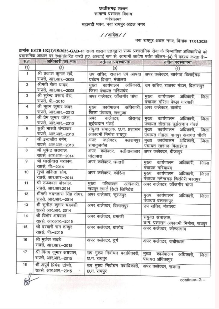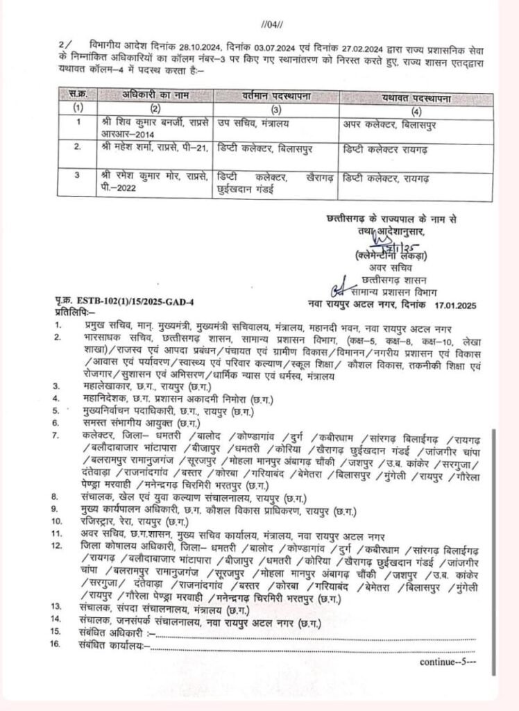 छत्तीसगढ़ में आचार संहिता से पहले 60 प्रशासनिक अधिकारियों के तबादले: एडिशनल कलेक्टर से लेकर डिप्टी कलेक्टर तक बदले… देखें लिस्ट