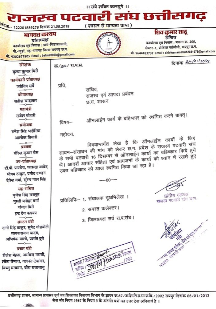 छत्तीसगढ़ में पटवारियों की हड़ताल खत्म: अब पटवारी पहले की तरह करेंगे काम, आमजन को मिलेगी बड़ी राहत, जानिए क्या था हड़ताल का कारण…