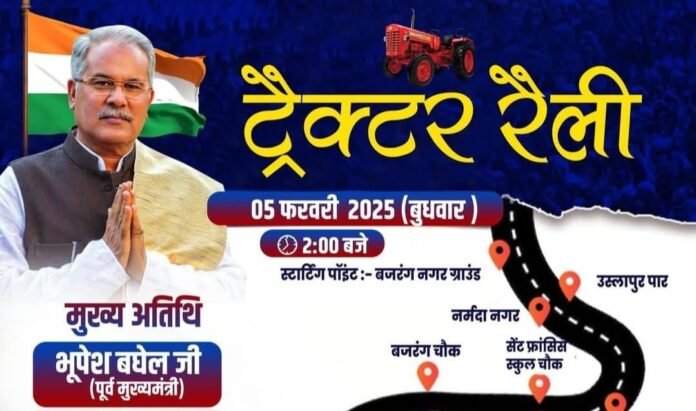 बिलासपुर, 5 फरवरी: छत्तीसगढ़ की राजनीति में नगर निगम चुनावों को लेकर सरगर्मी तेज हो गई है। कांग्रेस पार्टी के महापौर प्रत्याशी प्रमोद नायक के समर्थन में एक ऐतिहासिक ट्रैक्टर रैली का आयोजन किया जा रहा है। इस विशाल रैली का नेतृत्व राज्य के पूर्व मुख्यमंत्री भूपेश बघेल करेंगे। कांग्रेस कार्यकर्ताओं, किसान भाइयों और आम जनता की भागीदारी से यह रैली एक भव्य आयोजन बनने जा रही है।