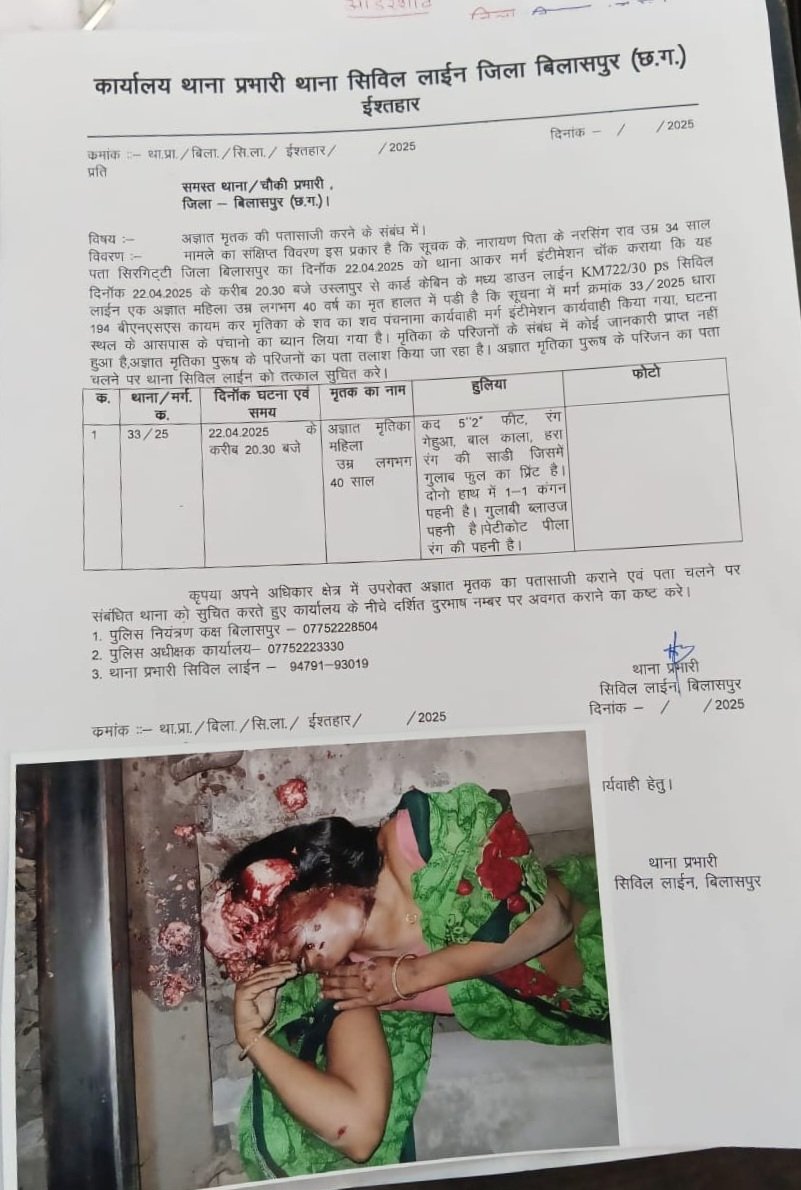 बिलासपुर। उसलापुर रेलवे ट्रैक पर एक अज्ञात महिला की लाश मिलने से इलाके में सनसनी फैल गई है। महिला की उम्र लगभग 40 वर्ष बताई जा रही है, लेकिन उसकी पहचान अब तक नहीं हो सकी है।