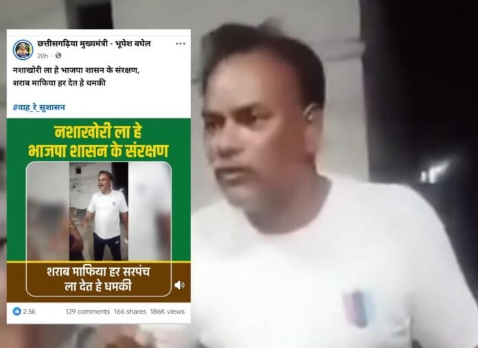 बिलासपुर। छत्तीसगढ़ के बिलासपुर जिले में अवैध शराब और शराब माफियाओं को लेकर सियासत चरम पर है। मस्तूरी क्षेत्र के लिमतरा गांव में एक सरपंच को शराब कोचिये द्वारा खुलेआम धमकाने का मामला सामने आने के बाद विपक्षी कांग्रेस ने राज्य सरकार और सत्तारूढ़ भारतीय जनता पार्टी पर तीखा हमला बोला है। सोशल मीडिया पर वायरल हुए एक वीडियो के बाद यह मुद्दा और गरमा गया है, जिसमें एक कथित शराब कारोबारी सरपंच को खुलेआम धमकी देते हुए दिखाई दे रहा है।
