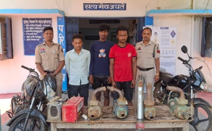 बिलासपुर। बेलगहना पुलिस ने मोटर पंप और बैटरी चोरी के मामले में बड़ी कार्रवाई करते हुए तीन आरोपियों को गिरफ्तार किया है। पुलिस ने आरोपियों के कब्जे से विभिन्न कंपनियों के 5 नग मोटर पंप, 2 नग बैटरी, एक मोटरसाइकिल और चोरी का अन्य सामान बरामद किया है, जिसकी कुल कीमत लगभग ₹1,40,000 आंकी गई है।
