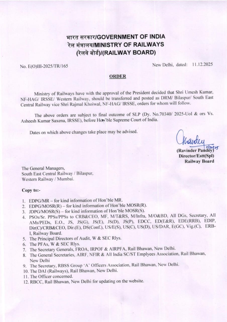 इसके अलावा वेस्टर्न रेलवे से SECR बिलासपुर में तैनात अधिकारी उमेश कुमार का भी तबादला कर दिया गया है। दोनों अधिकारियों पर ऑपरेशन और सुरक्षा संबंधी गंभीर लापरवाही का आरोप माना जा रहा है।