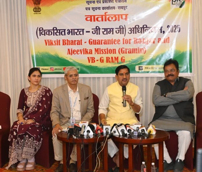 भारत सरकार के पत्र सूचना कार्यालय (पीआईबी), रायपुर द्वारा छत्तीसगढ़ के बिलासपुर में एक दिवसीय क्षेत्रीय मीडिया कार्यशाला ‘वार्तालाप’ का आयोजन किया गया। कार्यशाला का केंद्रीय विषय ‘विकसित भारत—गारंटी फॉर रोजगार एंड आजीविका मिशन (ग्रामीण)’ रहा, जिसे जी-राम-जी (VB-GRAM G) अधिनियम, 2025 के रूप में मनरेगा में युगांतकारी सुधार के तौर पर प्रस्तुत किया गया। कार्यक्रम के मुख्य अतिथि केंद्रीय आवासन एवं शहरी विकास राज्य मंत्री तोखन साहू रहे।