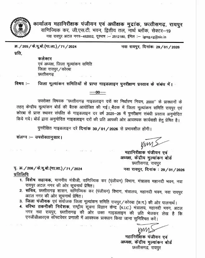 गौरतलब है कि छत्तीसगढ़ शासन ने वर्ष 2025-26 के लिए नई गाइडलाइन दरें पूरे राज्य में लागू की थीं। “छत्तीसगढ़ गाइडलाइन दरों का निर्धारण नियम, 2000” के तहत केंद्रीय मूल्यांकन बोर्ड, रायपुर द्वारा अनुमोदित ये दरें 20 नवंबर 2025 से प्रभावी हुई थीं। यह संशोधन वर्ष 2018-19 के बाद पहली बार राज्यव्यापी स्तर पर किया गया था।