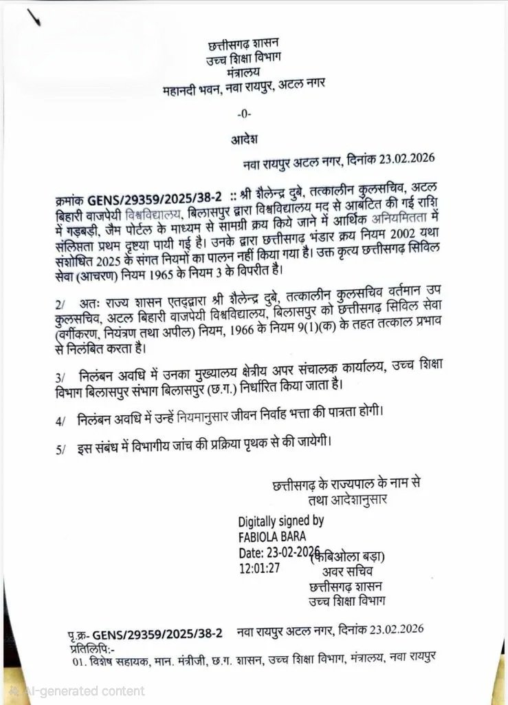 बिलासपुर, 23 फरवरी 2026। छत्तीसगढ़ शासन के उच्च शिक्षा विभाग ने अटल बिहारी वाजपेयी विश्वविद्यालय, बिलासपुर के तत्कालीन कुलसचिव शैलेन्द्र दुबे को गंभीर वित्तीय अनियमितताओं के आरोप में तत्काल प्रभाव से निलंबित कर दिया है। जारी आदेश के अनुसार विश्वविद्यालय मद में आबंटित राशि के उपयोग, जेम पोर्टल के माध्यम से सामग्री क्रय में आर्थिक गड़बड़ी तथा छत्तीसगढ़ भंडार क्रय नियम 2002 (संशोधित 2025) के प्रावधानों की अवहेलना प्रथम दृष्टया पाई गई है।
